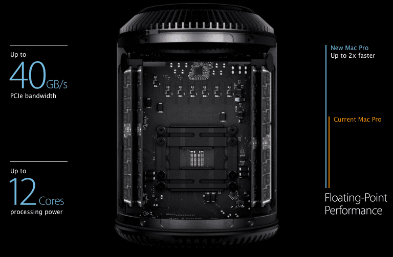 Designed around an innovative unified thermal core, the all-new Mac Pro packs unprecedented performance into an aluminum enclosure that is just 9.9-inches tall and one-eighth the volume of the previous generation. Mac Pro features 4-core, 6-core, 8-core or 12-core Intel Xeon processors running at Turbo Boost speeds up to 3.9 GHz and two workstation-class AMD FirePro GPUs that deliver up to eight times the graphics performance of the previous generation Mac Pro.