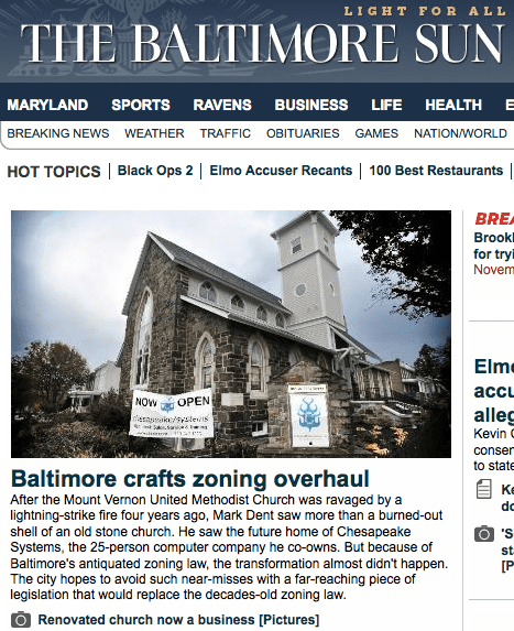 Chesapeake Systems was featured in a front page article in The Baltimore Sun (11/14/2012) regarding proposed zoning changes for the city. Highlighted are the company’s tribulations in getting approval for renovating Hampden’s Mt. Vernon United Methodist Church, vacated after a fire four years ago, into today’s innovative, modern, yet historically-respectful workspace.