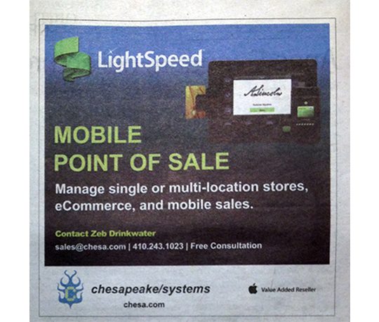 If you are looking for an innovative mobile POS solution for your business, then contact us about LightSpeed. ad in The Baltimore Messenger Contact Zeb Drinkwater for more info about LightSpeed. Also, read Clark Riley's article abo...